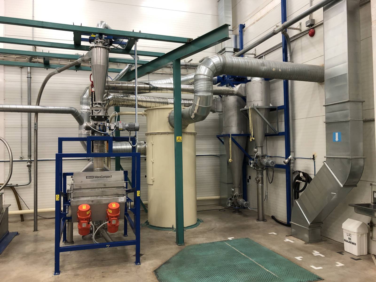 Imput material is cleaned on a specially designed JCC 08 screen cleaner that separates large and small impurities. The main cleaned fraction is aspirated in the JAA 08 aspiration channel. For destoning was used a specially modified destoner JGD 05. The aspiration air with the material is conveyed to the cyclone JVC 630, for JGD 05 destoner and to the cyclone JVC 550, for JCC 08 cleaner. Obtained material can be used in further processing. Material in a line is conveyed by pneumatic conveying, in order to transport material of different volumetric weights in the range of 40 – 650 kg / m3. All air is finally cleaned in a filtering device where 99.9% of light impurities are removed.